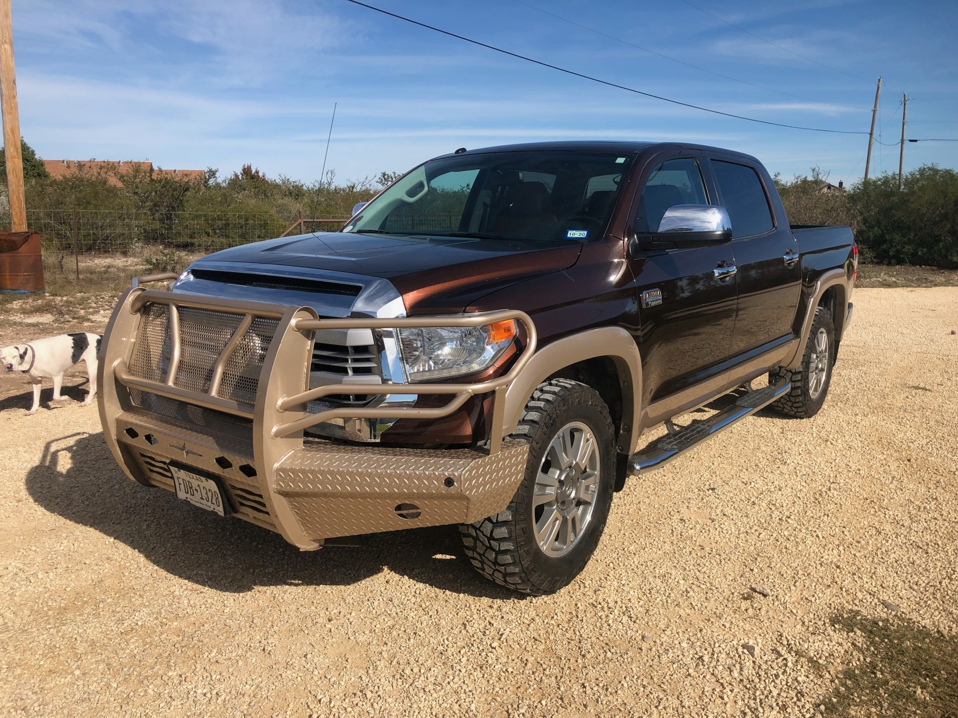 2015 Toyota Tundra CrewMax 4x4 1794 Edition with Frontier full-replacement front grill guard, Cooper 10-ply mud/snow tires, bedliner, leather seats, heated & cooling front seats, sunroof, running boards and touch screen premium audio with navigation. Excellent condition with 104,000 original HIGHWAY miles. Priced in the medium range of the Kelley Blue Book cash offer. Will have it detailed before pick up.