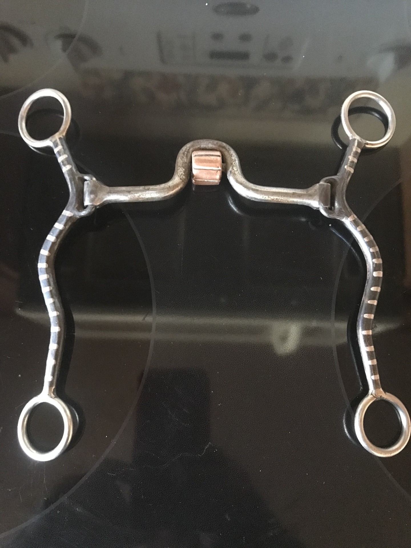 Handmade bit; port with copper roller, shanks shovel at mouthpiece, blued shanks with inlaid silver, copper roller, copper inlaid in the mouthpiece, has an excellent feel of balance. PayPal only.