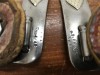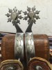 Excellent pair of non typical spurs made by the award winning maker the late RF Ford. He is featured in the Martin’s book on modern makers, as well. They are marked R.F. FORD 389 and match description in his order book. Unusual in that he marked them on the ourside of the bands. Overlaying the lady’s leg was not typical either. Very good condition. 2" rowels, 3 1/4" heel openings, 7/8" bands, 2 1/8" shanks. We pay shipping within the 48 states and accept most forms of payment.