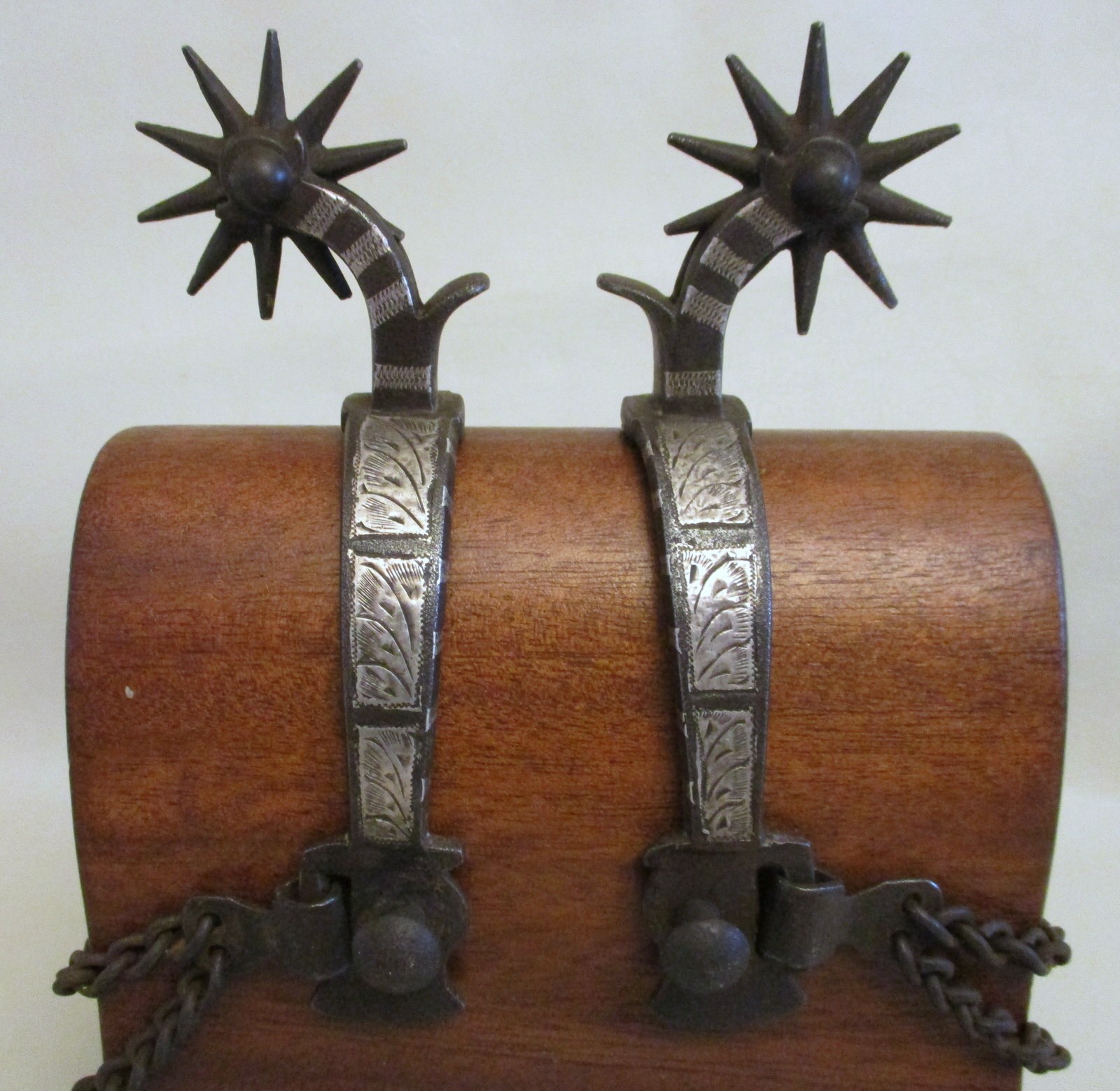 Measurements: Heel Band at Shank a little less than ¾”, Shank 1 ⅝”, Rowel 1 ¾”, Points 10, Heel Opening 3 ⅜”, Weight of Both Spurs 14oz