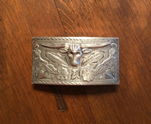 Sterling box buckle. Engraved with a steer head and rope edge. Fits a 1 1/2” wide belt. Buckle is 3” long, 1 1/2” wide, 3/8” deep. Made in Mexico.