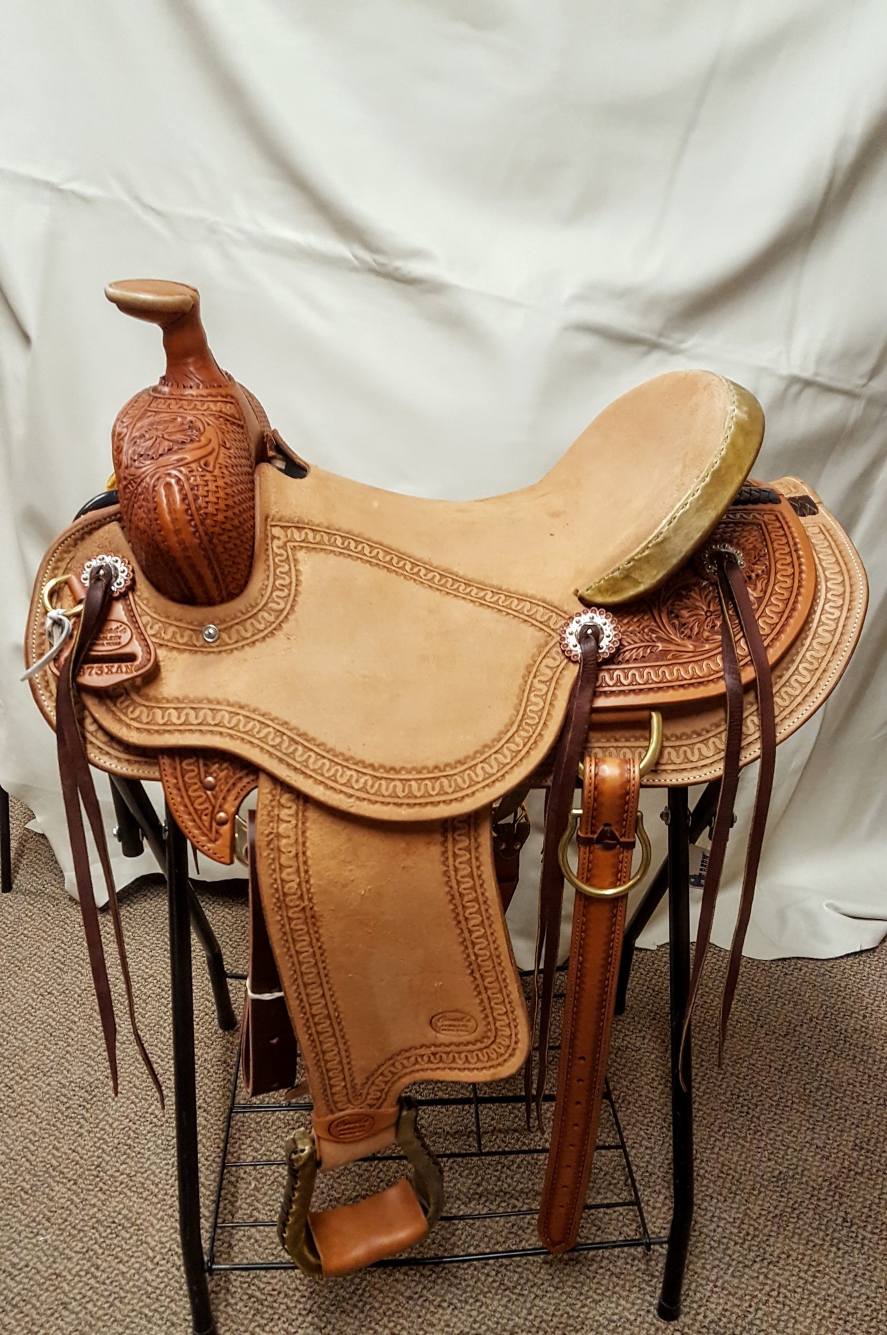 New, Never used 15.5 hard seat courts ranch saddle. rough out jockey and fenders with full border tooling and basket and floral skirts and swells with flat plate rigging. one of the last new courts saddles.