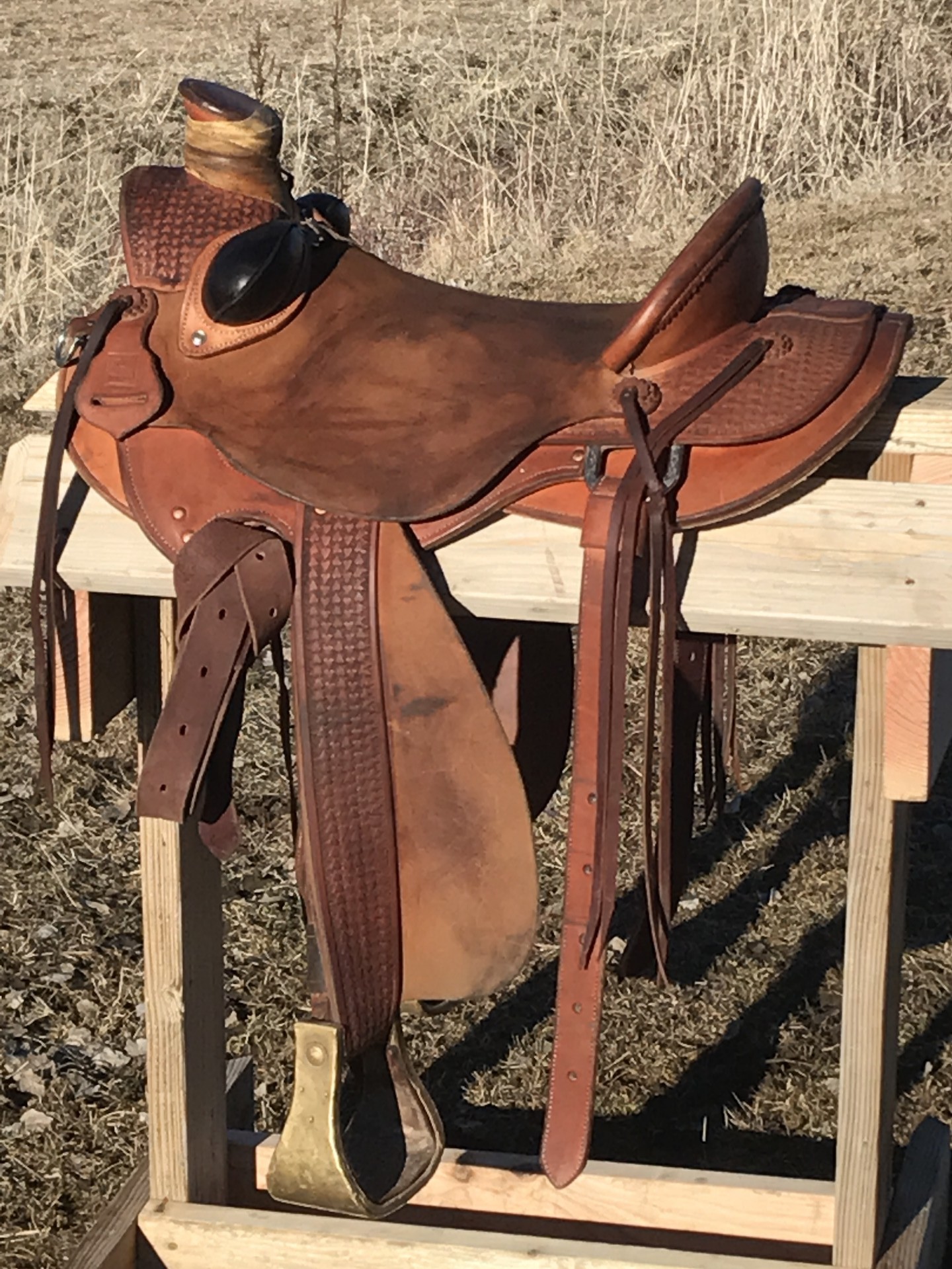 New 16" wade saddle made by Hank Moss of square dot saddlery. Nice saddle solid tree, great horn and comfortable seat. Used several times hasn’t sored any horses.
