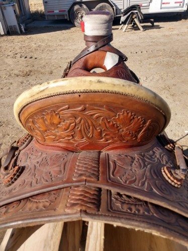 Weatherly tree, 15 1/2" seat, 12" x 5" Shovel cantle, 4" x 4" Wood post horn, 6 1/4" gullet x 8" tall, Rawhide cantle, horn, and fork binding, 3/4 Single Flatplate riggin, Old Square Skirts, Full Wild Rose Tooled, 4 Button seat, New 4" Bell Monel stirrups. This saddle is marked fro Elko, Nevada in excellent condition. For Sale or Trade.
