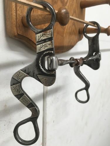 HOBBS 2013 marked bit made by Oklahoma maker Mick Hobbs. This bit has had very little use. It had a little light surface rusting from just hanging and it cleaned up about like knew. 5 3/16" mouth and 6 3/4" cheeks. Handy style of using bit. We pay shipping within the 48 states. We accept most credit cards, Pay Pal, money order, or check.