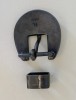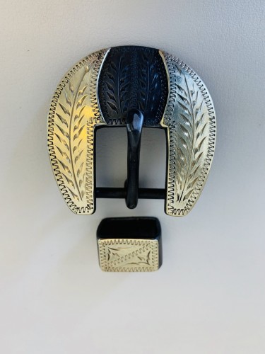 This is a new handmade headstall buckle made by bit and spur maker David Hunt from Panhandle, Texas. It is marked Hunt and his brand a joined 7 and H on the back of the buckle. David is a well-known bit and spur maker and has been building for over a decade. The buckle is steel with a dark iron finish and is mounted with engraved brass on the sides. There is engraving in the steel between the mountings. It would also work as a chap belt buckle.