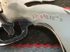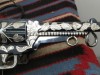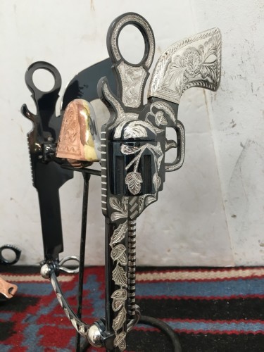 Very well done pistol bit marked CHARLIE"s and made for Charlie’s by long time steel and metal artisians. This bit has so much work in it the way they designed the single action look, inlaid the silver, and finished the steel. 5 1/8" mouth and 7 1/2" cheeks. We pay shipping within the 48 states and accept most forms of payment.