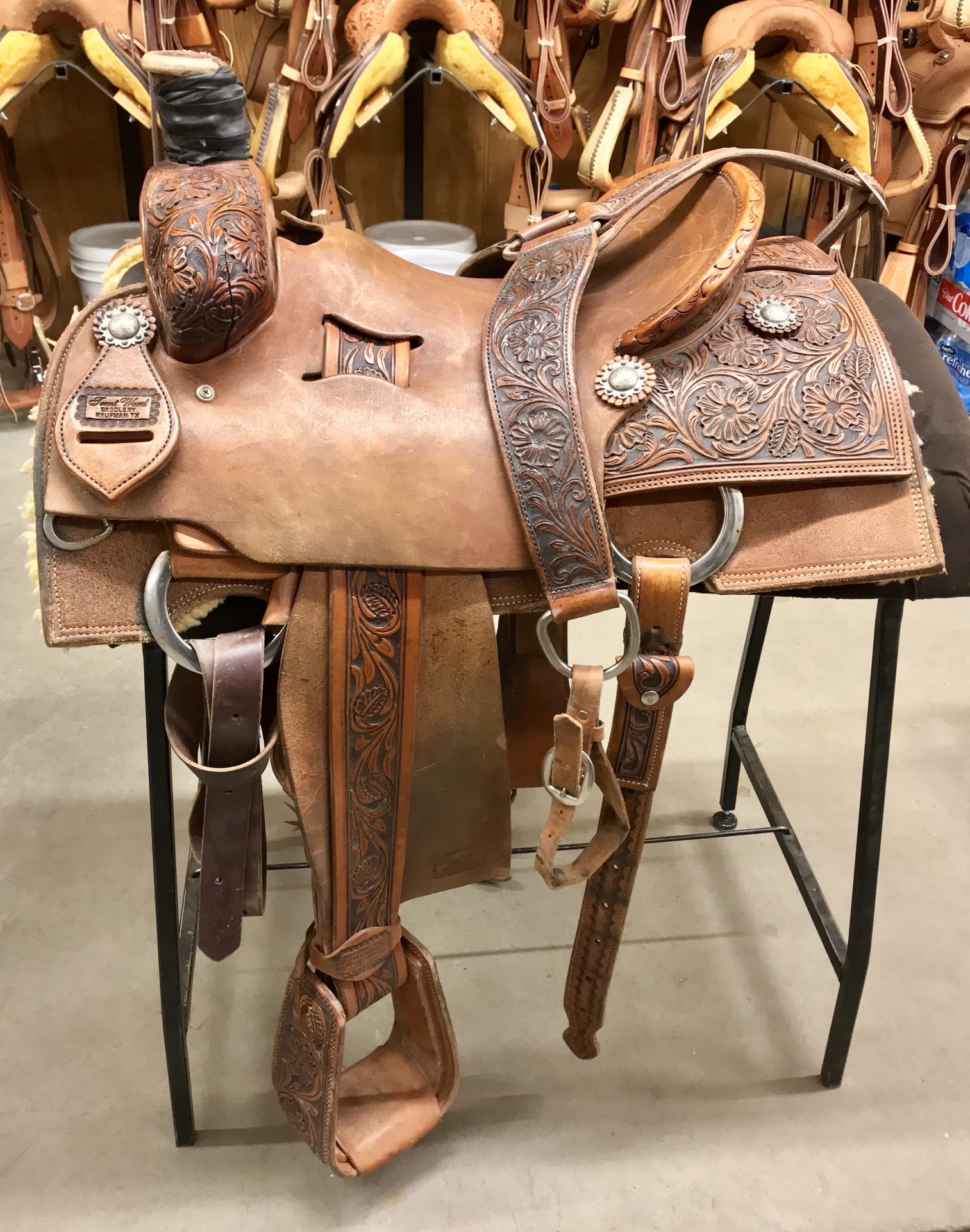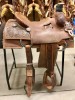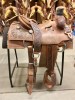 16" Trent Ward rope saddle. Seat rigged, 1/4 floral tooled, antiqued, with square skirt and real wool. Comes with matching breast collar. $1895, seller will pay for freight in the U.S.