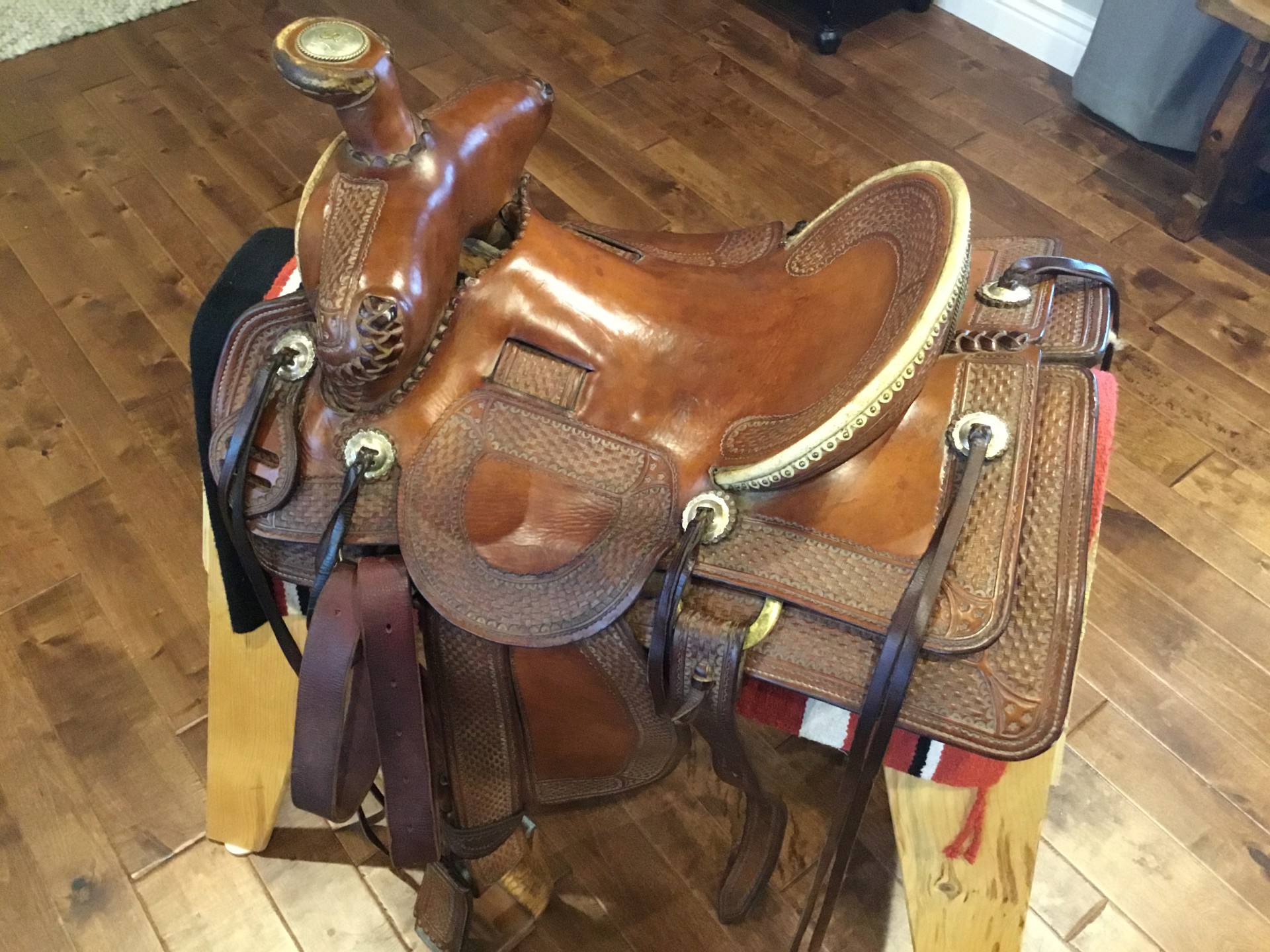 This is a very unique saddle made by Troy Ehrmentraut out of Wyoming. Saddle is exceptionally tooled, very nice design, piece of true craftsman ship. The fleece is rough, Could use replacing, however I have a few tell me all you need is a good pad. This saddle was custom built in 1997, but I would dare say it’s really even broke in. Check out photos, feel free to ask questions, thanks for looking