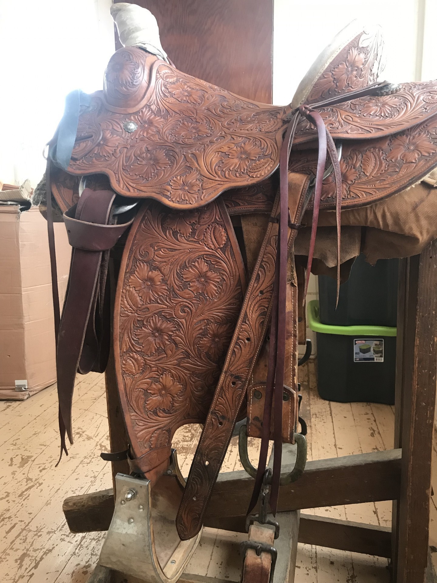 15” full floral stamped mike Morgan saddle out of az. Excellent condition. Hardly used. Engraved silver conchos, horn cap and cantle plate. Good leather and sheepskin. Comes with stirrups, cinches, rope strap ready to use. A steal at $2500.00