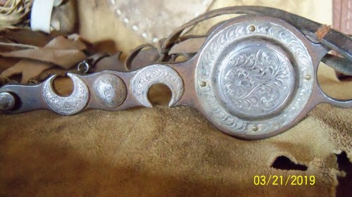 Beautiful Leon Gage Las Cruces half-breed sterling silver bit. The conchos measure 2-1/4". It has the two engraved crescent moons and small conchos in middle. I showed my bit to Leon and he said he made it in the 1980’s. The bit is 7-1/2" long. The mouthpiece is 5-1/4" wide and the half breed is 2" high.