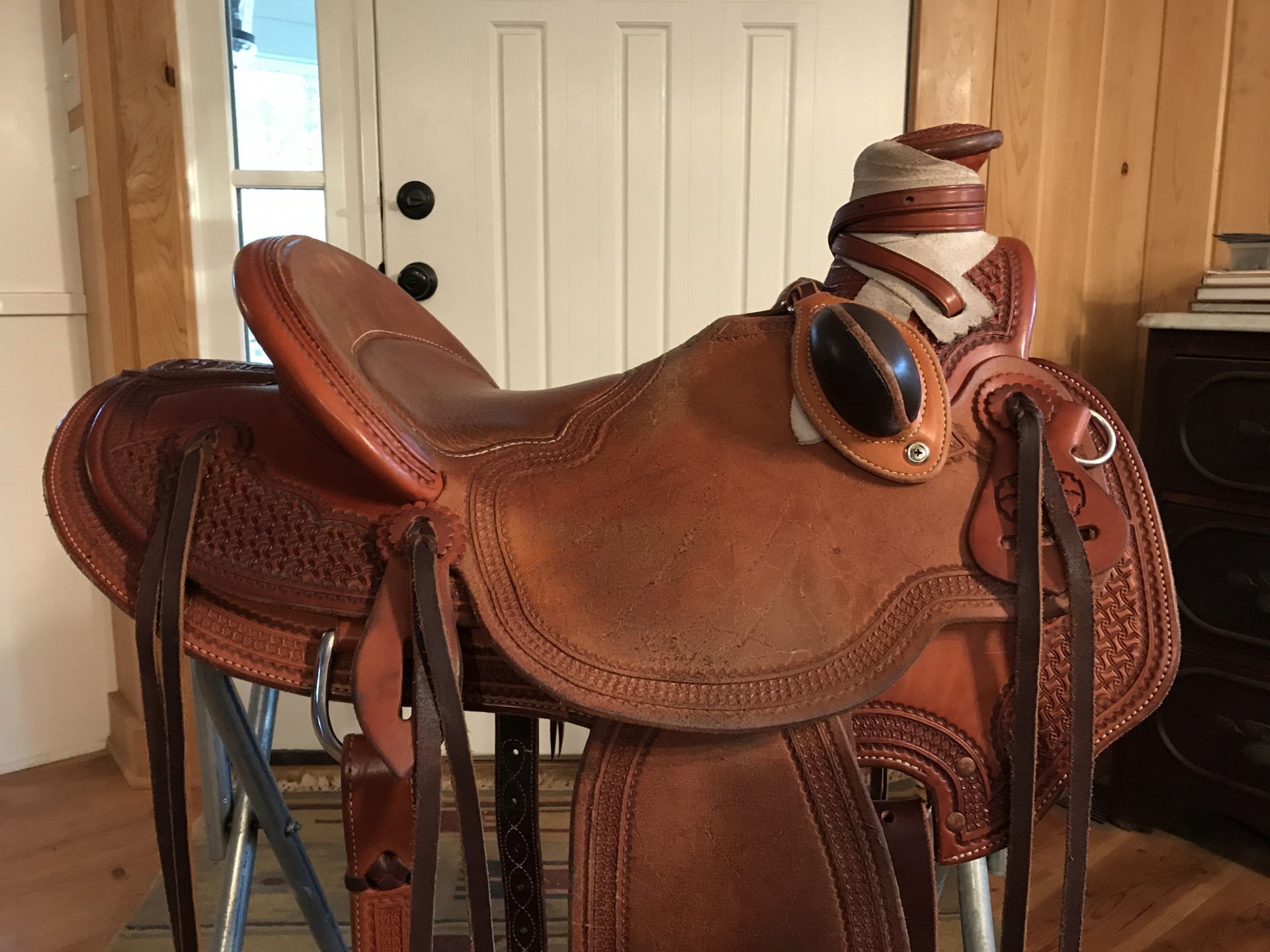 Like new lady wade, 15", FQHB, roughout seat and fenders, padded inlaid seat, bucking rolls. Buyer pays shipping.