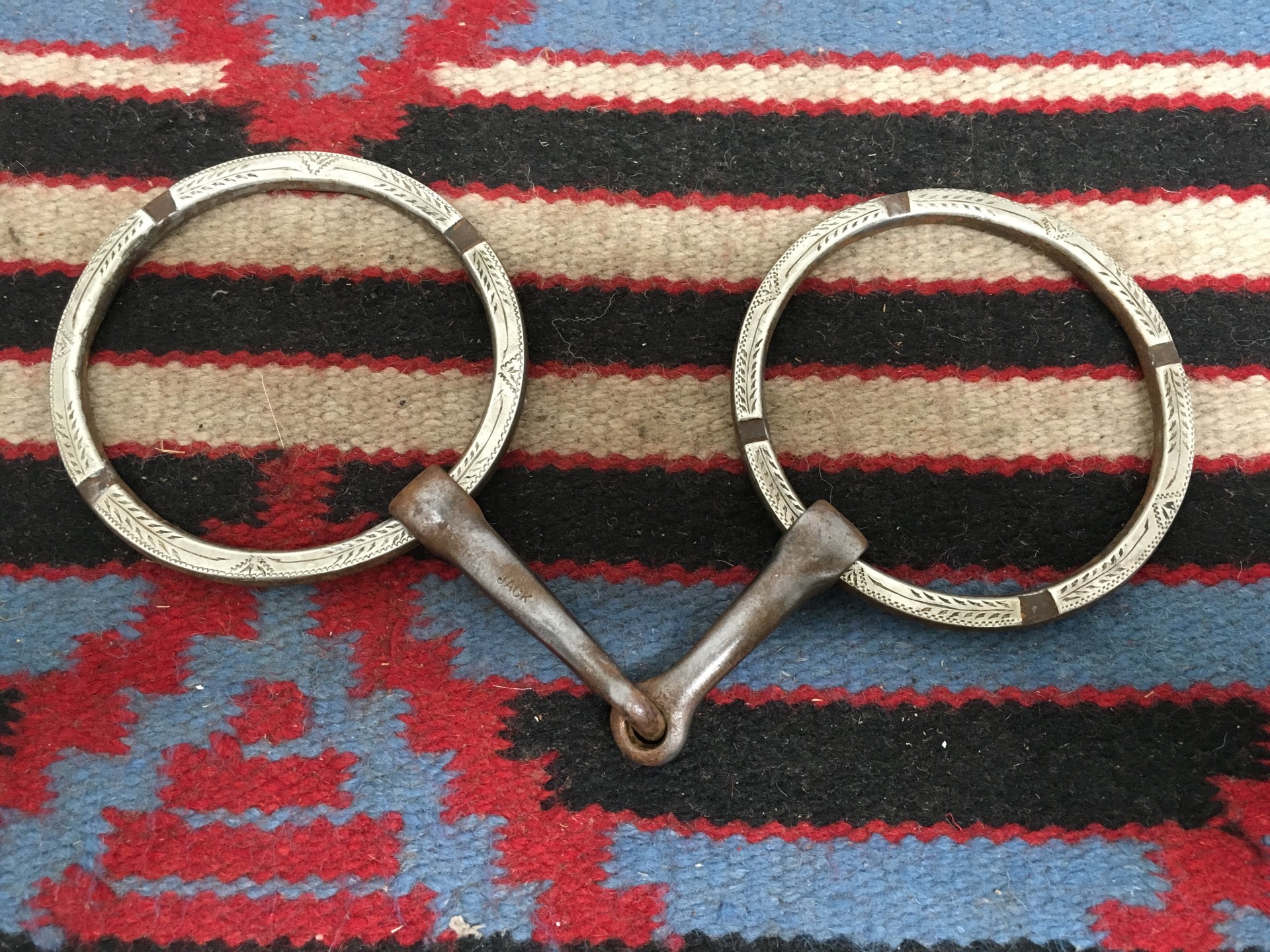 Good used bit marked JACK and made by Texas panhandle maker Cody Jack. Copper inlays in the 4 7/8" mouth and 4 1/2" diameter mounted rings. Quality bit by a popular maker. We pay shipping within the 48 states. We accept most credit cards, Pay Pal, money order, or check.