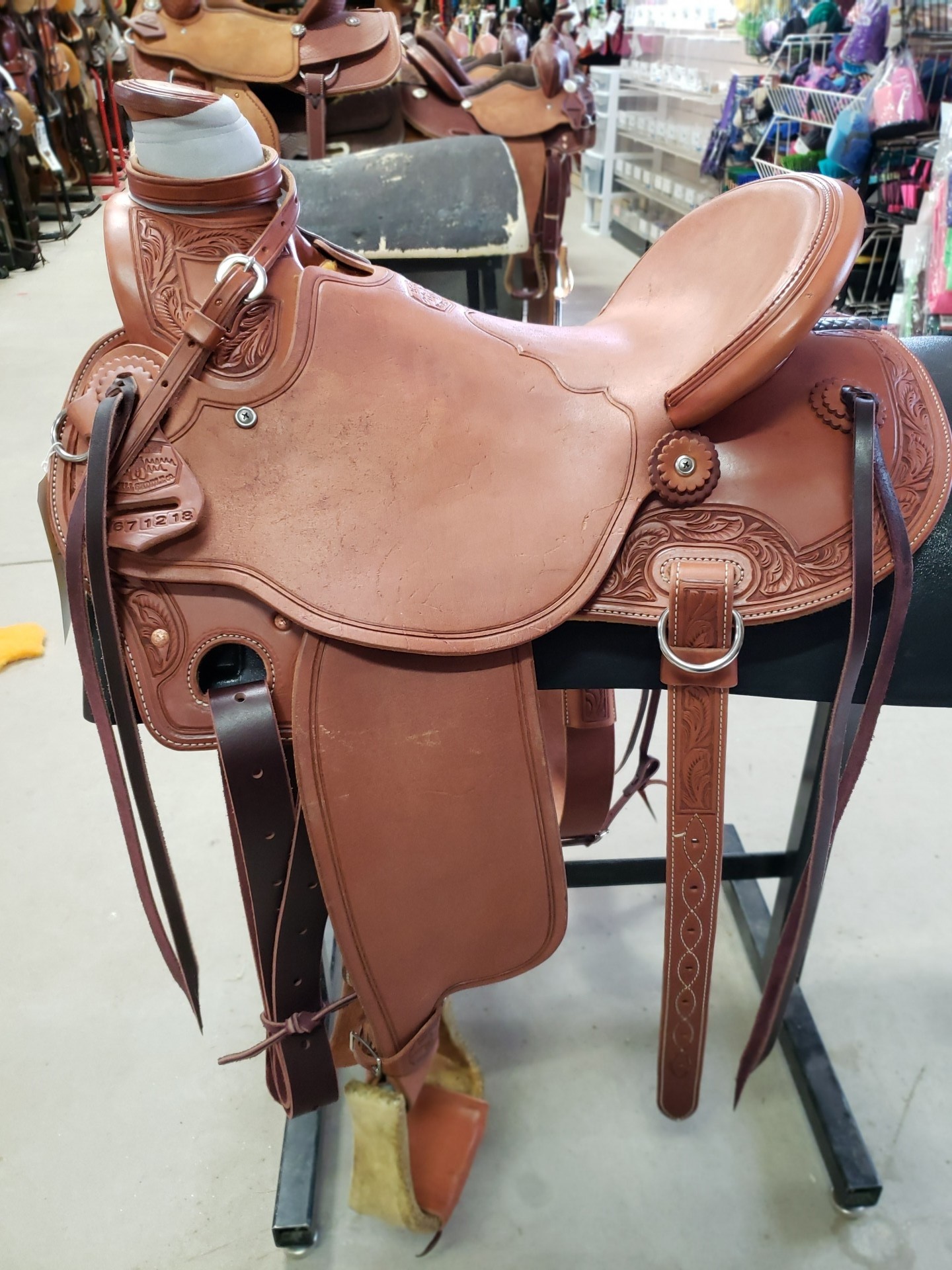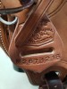 This saddle comes with minimal border tooling. Completed with a roughout seat, seat jockey, and fenders. Comes with a back cinch and saddle strings.