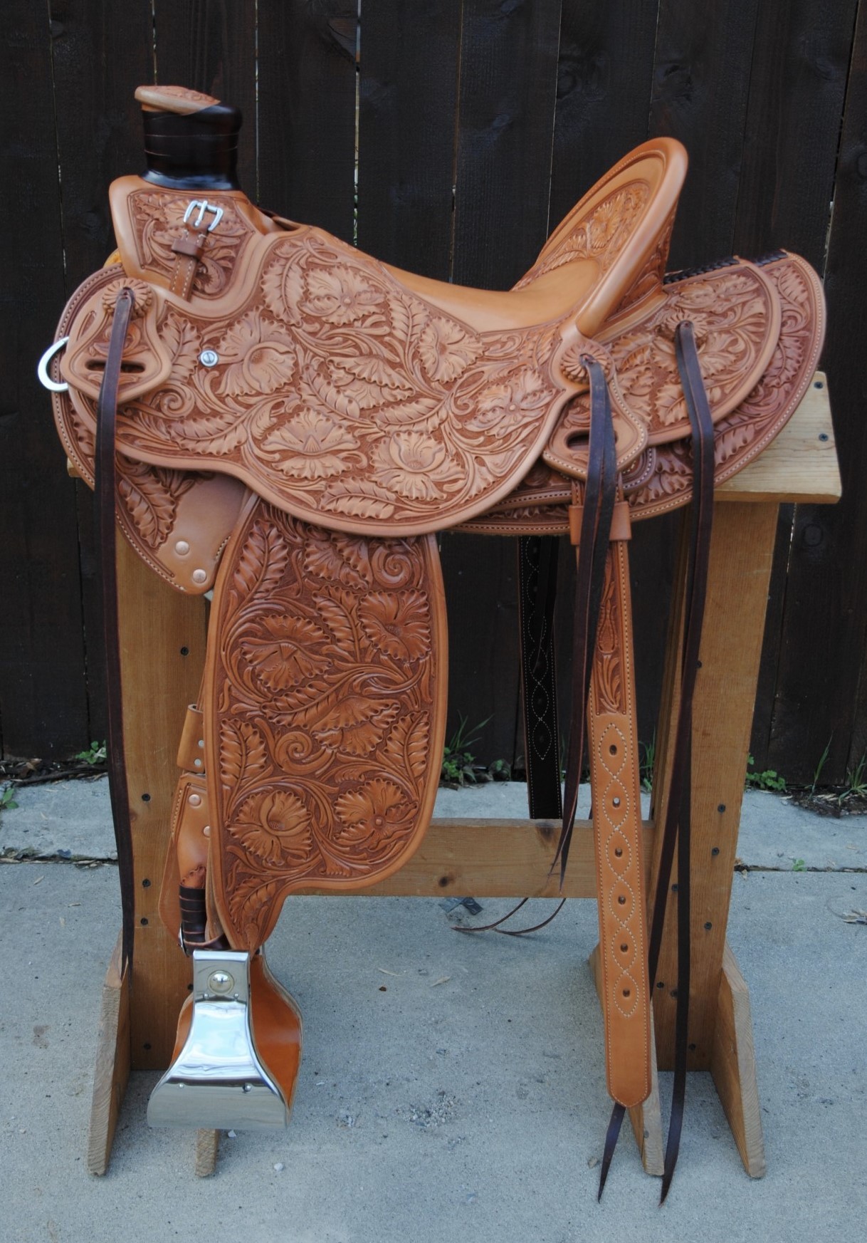 Brand new full carved saddle. I had an extra tree so made this one up while I was waiting on trees. It is a Keith Gertsch tree, 7/8 flat plate rigging, 15.5" seat. Call for other details.