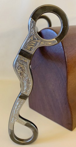 This is a new handmade solid shank curb bit made by long time bit and spur maker Don Rogers from Hereford, Texas. Don has been building since 1975 and his work is sought after by cowboys and collectors alike. Don is listed in Bits and Spurs, Motifs, Techniques and Modern Makers by Ned and Jody Martin. The bit is marked Rogers on the port. The bit is steel with a dark finish and is mounted with engraved nickel silver. This would be a nice to use or to add to a collection.
