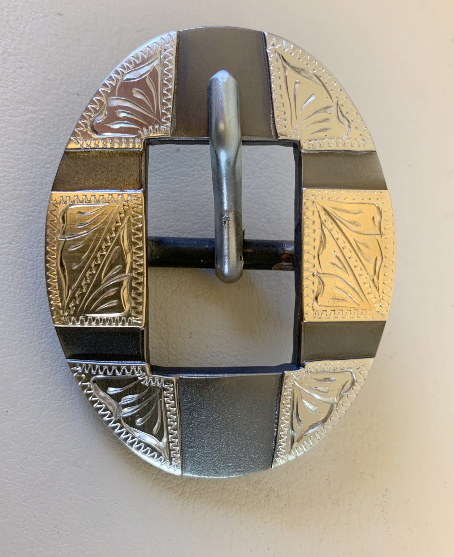 This is one new handmade ¾” headstall buckle made by long time bit and spur maker Don Rogers of Hereford, Texas. Don has been building since 1975 and his work is sought after by cowboys and collectors alike. Don is listed in Bits and Spurs, Motifs, Techniques and Modern Makers by Ned and Jody Martin. The back of the buckle is marked Rogers. The buckle is steel with a dark gray finish and is mounted with engraved brass and nickel silver.