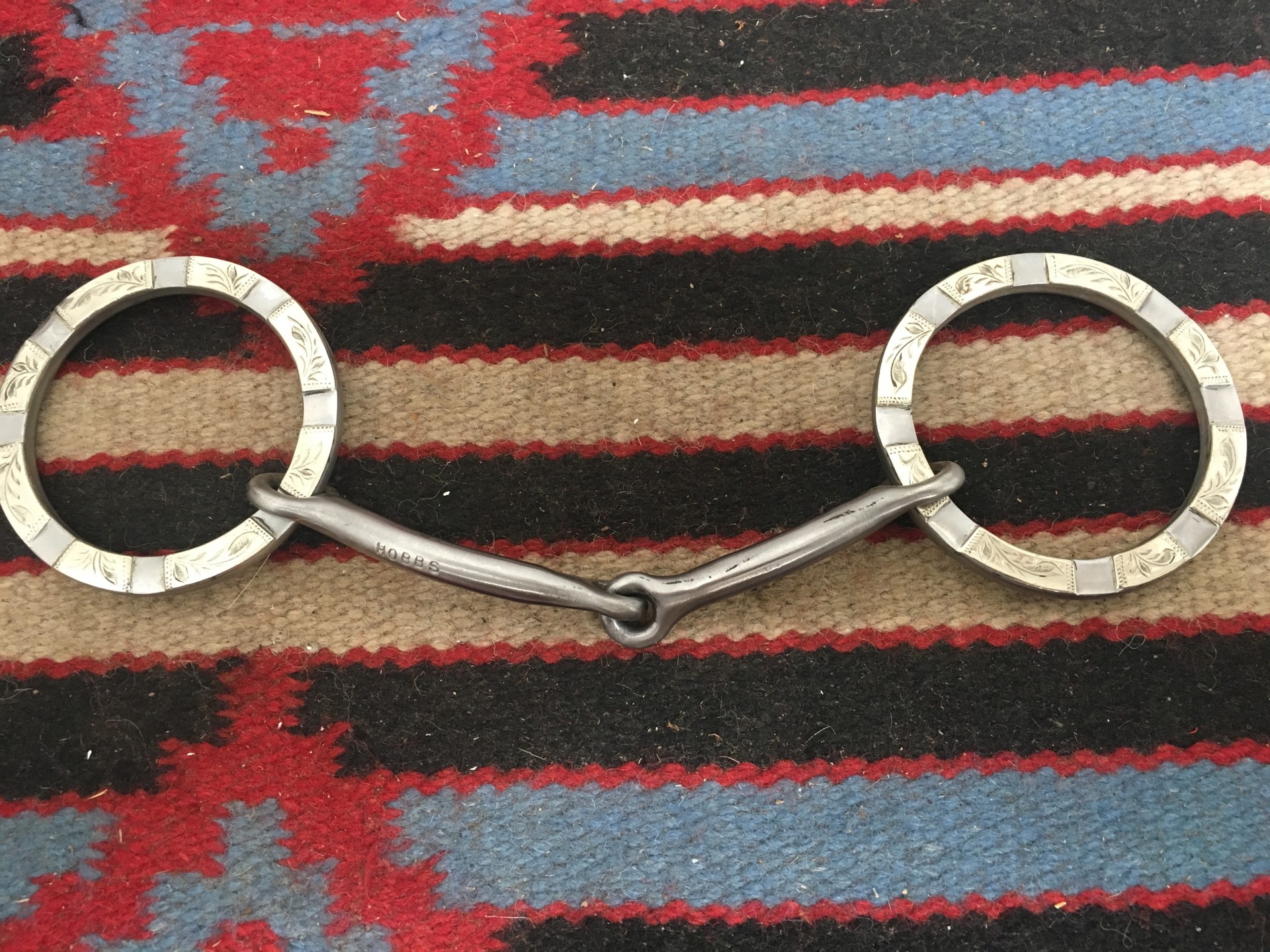 Mick Hobbs made HOBBS marked unused ring snaffle with 3 1/4" od rings with 16 pieces of hand engraved mountings and 5 1/4" mouth with copper inlays, Very functional ring snaffle by a good long time maker. We pay shipping within the 48 states. We accept most credit cards, Pay Pal, money order, or check.