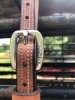 1” Herman oak harness split ear headstall. leather is double and stitched and tapers to 3/4 at the buckle, leather is mark Blevins and has a David Andrews buckle.