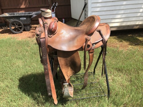 15 1/2” watts brothers saddle, full quarter horse bars, some minor scuffing from normal use, very comfortable, weighs about 45 lbs, fits a variety of horses well, great for training, provides a very secure seat, free shipping within contiguous Us, no returns, PayPal or Venmo