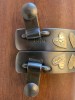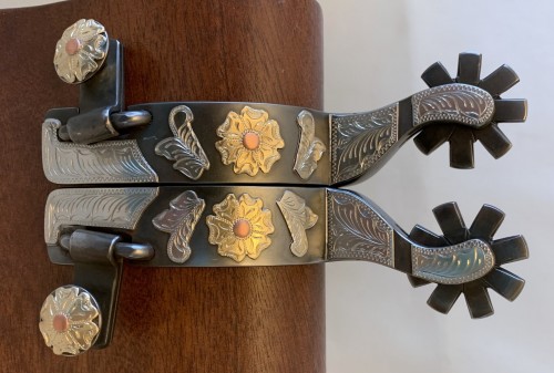 New handmade double mounted spurs made by long time bit and spur maker Don Rogers of Hereford, Texas. Don has been building since 1975 and his work is sought after by cowboys and collectors alike. Don is listed in Bits and Spurs, Motifs, Techniques and Modern Makers by Ned and Jody Martin. The spurs are marked Rogers on the outside of the heel bands. The spurs are steel with a gray finish and are mounted with brass flowers with a copper center on the button and heel band with nickel silver leaves. The offside is mounted with a brass heart in the center and nickel silver hearts on each side of the brass heart. These spurs would be nice to use or a great pair of spurs to add to a collection from a very collectible maker.