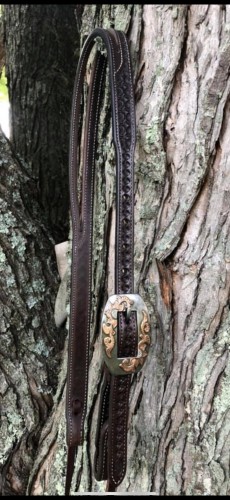 New Brandon Blevins stamped, lined with latigo, stitched split ear with Jesse Lawson 1 piece cart buckle. As nice a headstall and buckle as ul c. PLEASE TEXT OR CALL ONLY. Thank you
