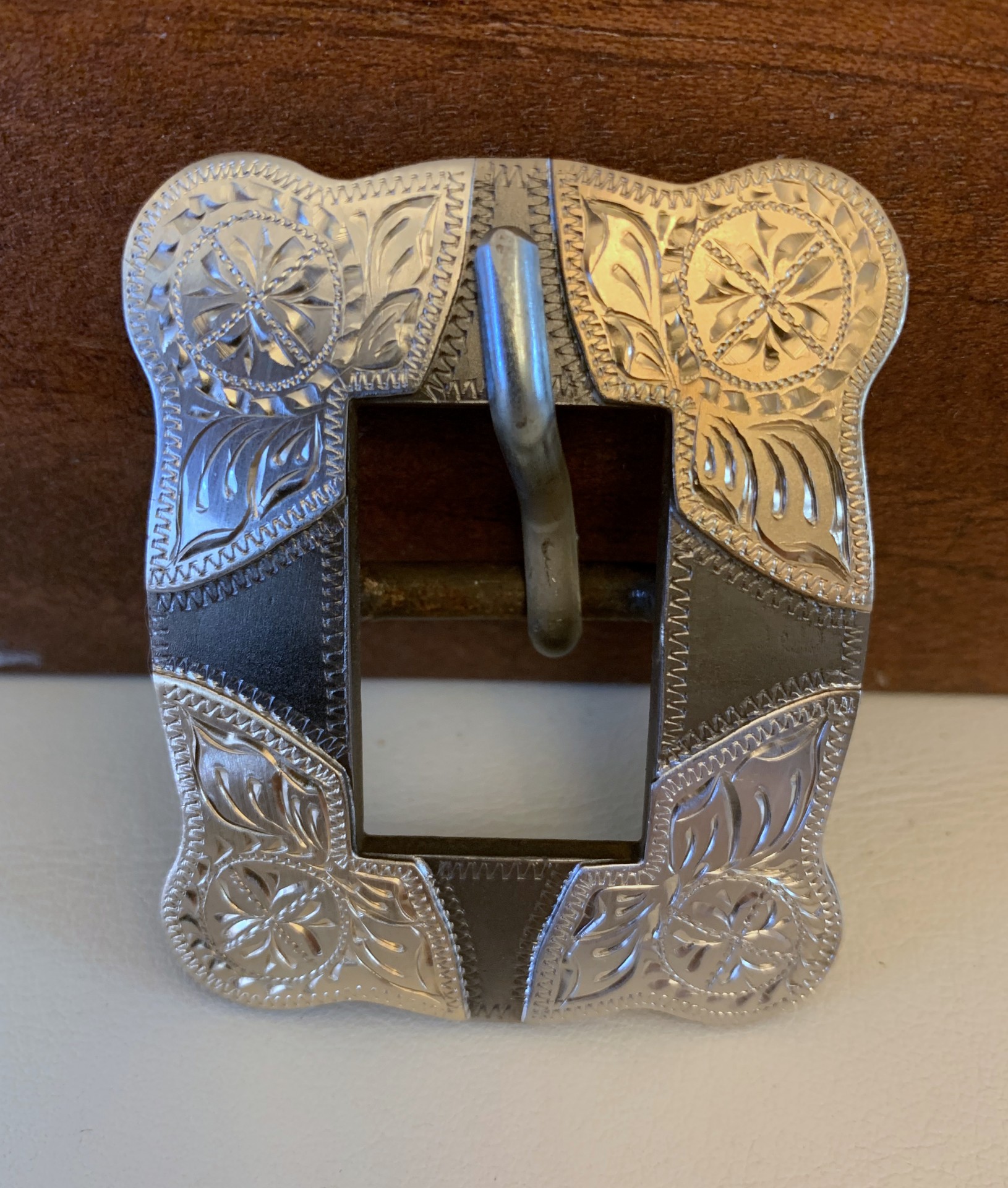 This is one new handmade ¾” headstall buckle made by long time bit and spur maker Don Rogers of Hereford, Texas. Don has been building since 1975 and his work is sought after by cowboys and collectors alike. Don is listed in Bits and Spurs, Motifs, Techniques and Modern Makers by Ned and Jody Martin. The back of the buckle is marked Rogers. The buckle is steel with a gray finish and is mounted with engraved brass and nickel silver. There is wiggle engraving in the steel around the mountings.
