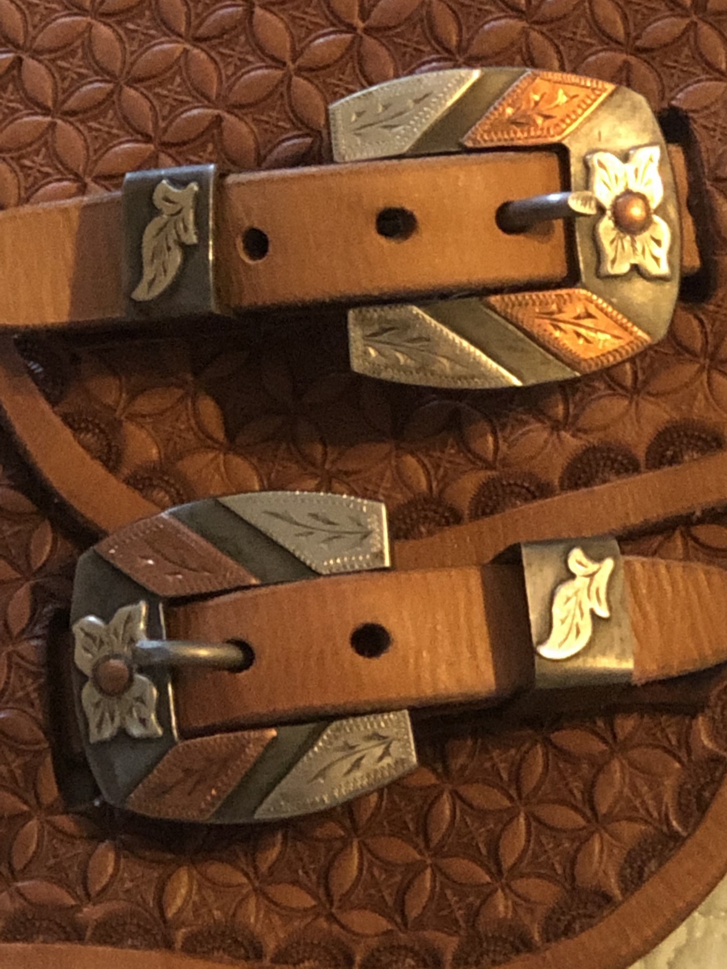 Good, wide, unused Dan Mccloy spurleathers w Danny Pollard buckles. Leathers are stamped and tough an buckles mounted w silver and copper. PLEASE TEXT OR CALL ONLY. Thank you