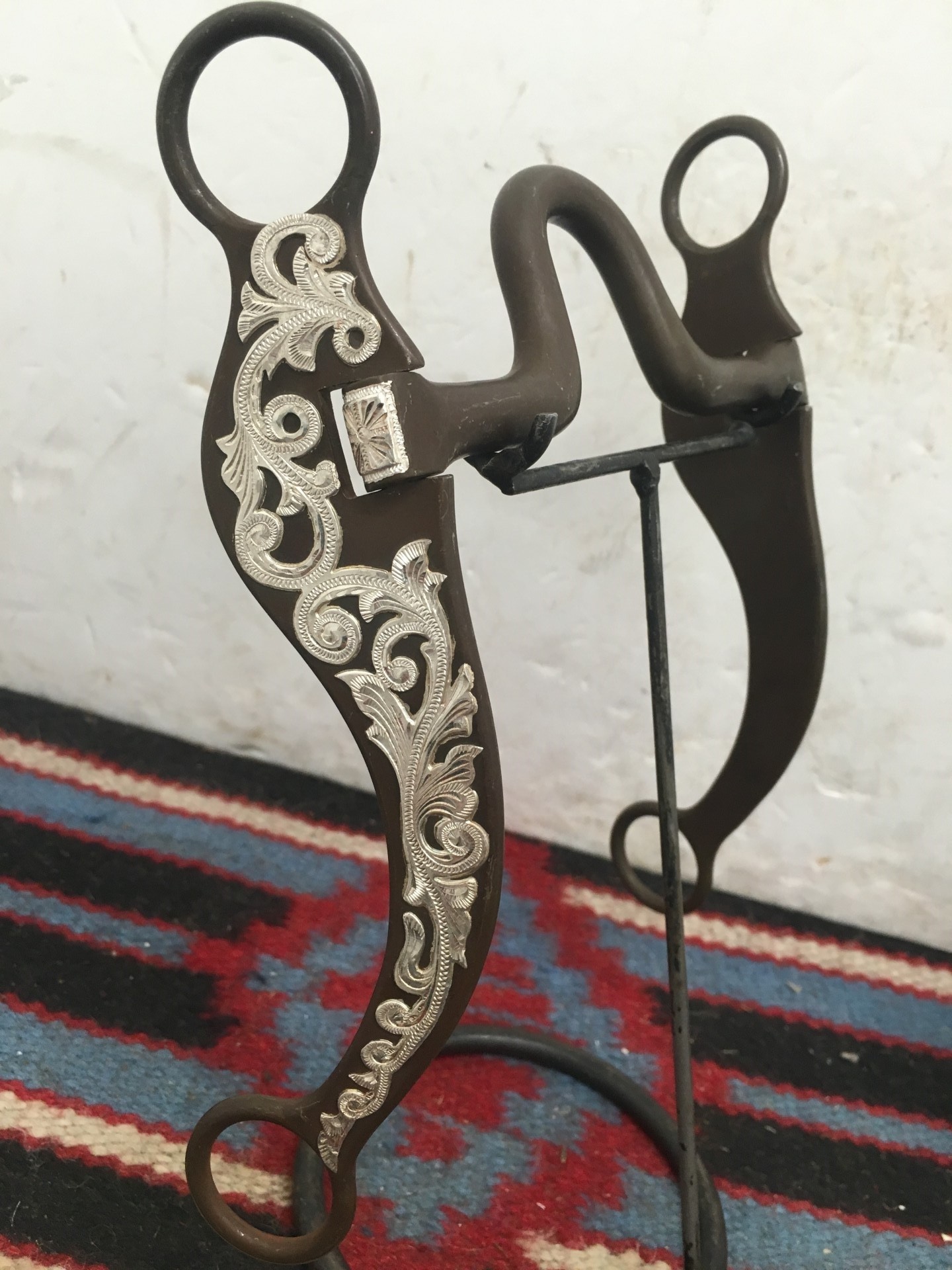 CHARLIE’S marked bit with copper inlays in the 5 1/8" mouth and 8 1/4" cheeks. This bit has weight balance. pure silver overlays. Made for Charlie’s by long time steel and silver craftsmen. We pay shipping within the 48 states. We accept most credit cards, Pay Pal, money order, or check