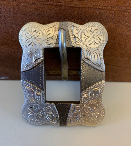 This is one new handmade ¾” headstall buckle made by long time bit and spur maker Don Rogers of Hereford, Texas. Don has been building since 1975 and his work is sought after by cowboys and collectors alike. Don is listed in Bits and Spurs, Motifs, Techniques and Modern Makers by Ned and Jody Martin. The back of the buckle is marked Rogers. The buckle is steel with a gray finish and is mounted with engraved brass and nickel silver. There is wiggle engraving in the steel around the mountings.