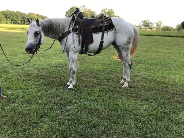 Beautiful 11 year old gray mare, with some legends in her breeding. Deedee has had a little of everything done on her, barrels, roping, some ranch work. Deedee will ride anywhere, I have rode her in pastures, woods, crossed ditches, penned cattle, she takes in new places really well. She is a sweet mare and is easy to catch in a pasture, gets along well with other horses, stalls, bathes, loads and trims with no problems. Vehicles, kids, dogs, don’t bother her at all. She is a easy keeper only selling her to help pay for our arena. She is current on coggins, vaccinations, trimming and has recently had her teeth done. Would make a good horse for a older kid or a great broodmare with her breeding and conformation. Asking $4000, but will entertain reasonable offers.