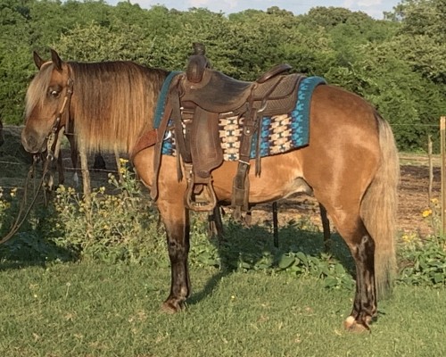He’s a great trail riding pony. He’ll cross water, go up and down hills, over logs and bridges and even down the road without issue. He will ride out alone with no silliness.