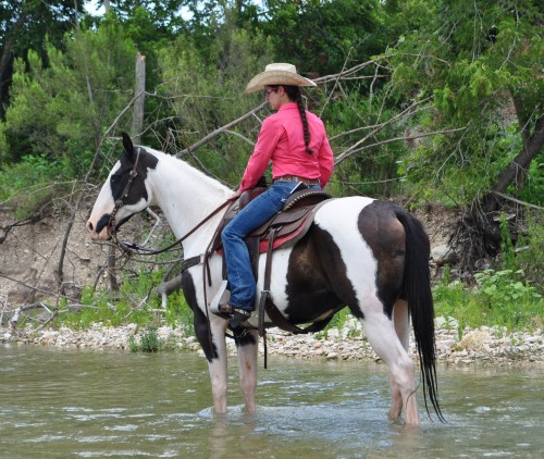 You could drive the wheels off your truck and trailer trying to find a black and white paint as nice as this one. Dice is beautifully marked, extremely quiet and gentle, very well broke, and just about as honest and safe as they come. He is 14 years old and 15.3 hh and has always had the best of care so he is sound with no health or soundness problems. Dice came off a big ranch in West Texas and has been used for all phases of ranch work, including sorting pairs, roping and doctoring cattle in the pasture, ponying colts, and checking fence. He has carried a flag in the grand entries and he rides just as quiet away from home as he does at home. He is the same horse every time you ride him, and he does not need to be ridden every day to stay gentle. Dice has an excellent handle and stop, and although he is big he has a nice smooth trot and lope that rides more like a little horse. Dice is a pleasure to ride out in the pasture, crosses water with no problem, and isn’t spooky. He will sidepass, work a gate and move off your leg. He is gentle enough for just about anyone to ride, but because of his size would not recommend him for small children. Dice rides quietly on a loose rein, and will never go any faster than you ask him to. He is laid back but responsive, not lazy, and although he prefers to be slow rather than fast he will go if you ask him to. Dice can be ridden out by himself or with other horses, and doesn’t mind being separated from the group. He has also been ridden alongside the road and in traffic and isn’t bothered by it. Dice has good ground manners, stands quietly tied, and is easy to catch, load, haul and shoe. Asking $4500. Call for more info: Aubrey at 830-377-7236 or Wendy at 210-363-1883. Serious inquiries only, no tire kickers! Please no emails or texts. Delivery is available but not included.