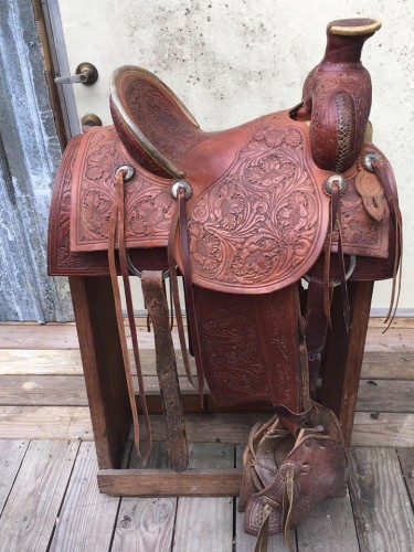 Custom Bar B Ranch saddle, one of the last, made by “John The Saddle Man” in Terrell, Texas. 15” seat, oak/acorn tooling, antiqued conchos, tapederos, reinforced stirrup leathers and built on a custom wood/rawhide wrapped moose tree. Like new with probably 20 rides on it. Barn kept and built like a tank. This will be the last saddle you ever buy.