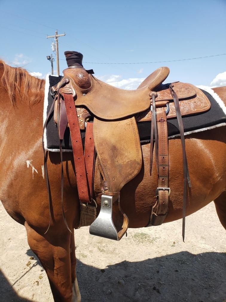 16" Nancy Martiny on a Warren Wright louellen tree. 3 1/4 X 3" horn 3 1/2" cantle. This saddle has 93°bars and fits horses great! Buyer pays shipping.