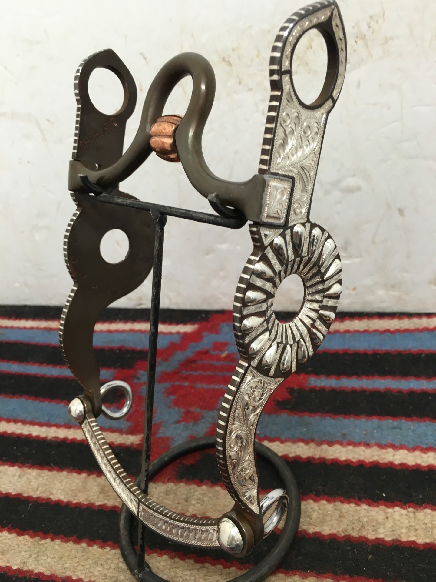 CHARLIE’S marked bit in unused condition with 7 1/2" cheeks and 5 1//8" mouth made by long time silver and steel artisians in Mexico. Lot of finish work on this bit with copper cricket and lip bar. We pay shipping within the 48 states. We accept most credit cards, Pay Pal, money order or check.