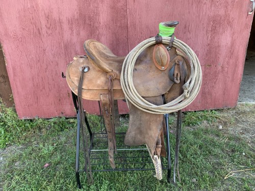 16 inch wade tree post horn ranch saddle. Comes with ox bow stirrups and bucking rolls. 4.5 inch cap on post horn. Plate rigging. Stamped but not legible due to work rough out. Asking 775 shipped.