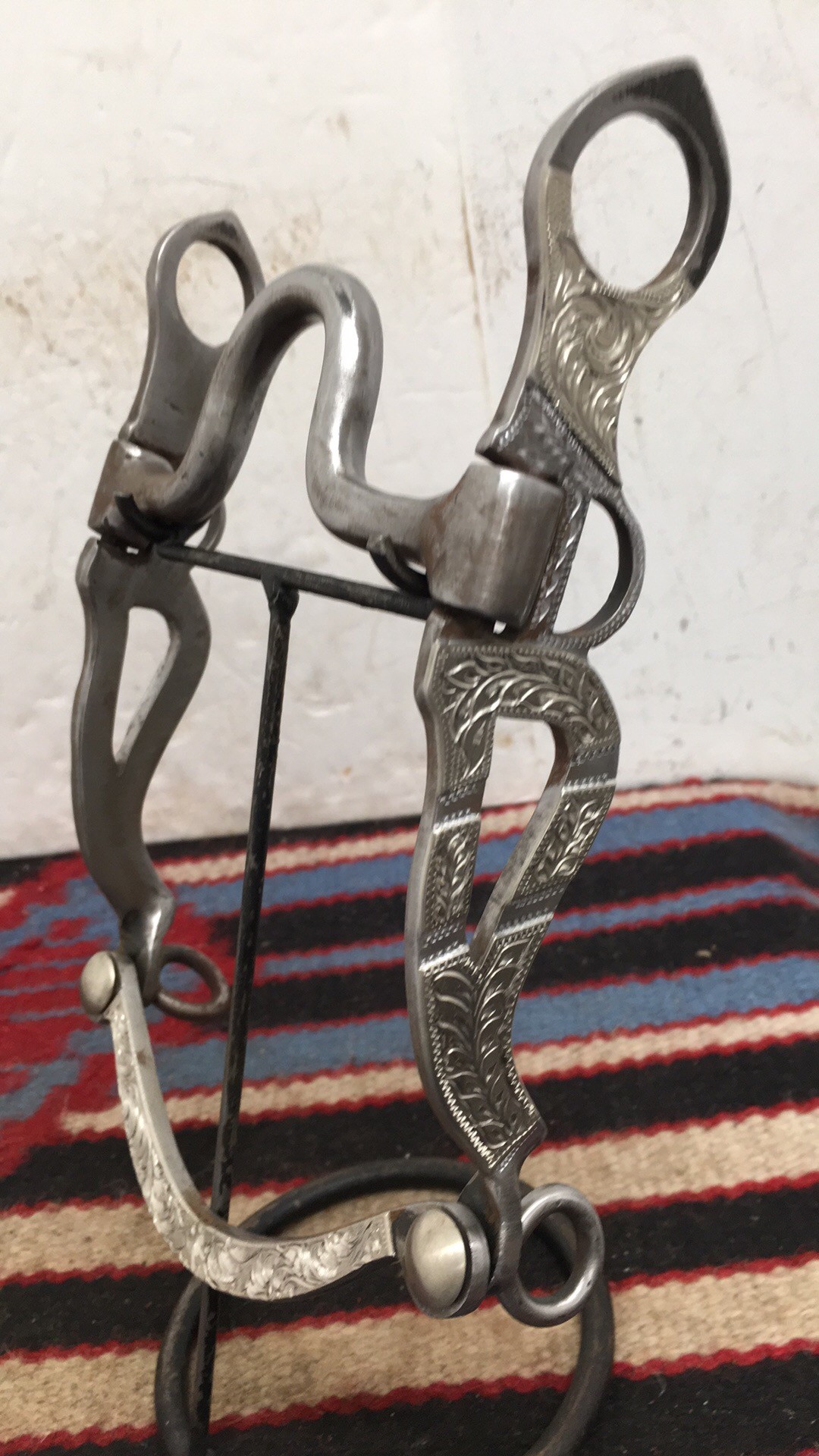 P^ marked bit made by noted bit maker Pat Vaughn, with 5" mouth and 7" cheeks. Bit features a mounted lip bar, an abundance of hand engraved overlays as well as engraving in the steel. Not a style that you will find every day. This is a good one. We pay shipping within the 48 states and accept most forms of payment.