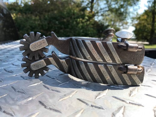 Nice set of double mounted spurs handmade by David Farkas. Old school mounted with lots of engraved silver bars. Lots of time went into this pair. All 4 buttons are engraved silver, as well as engraving on the shank itself and on the steel in between every bar. These spurs have seen very little use. Everything is tight and 100% original and good. PLEASE TEXT OR CALL ONLY. Thank you