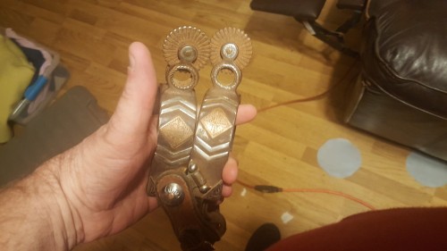 these spurs are tight and are blank on the inside of spurs ..marked m.i.c. with straps the pics seem to have them looking like sweet iron , they are not...just reg steel , didnt clean them cause some like the patina...but silver is bright email me at joebryan1966@gmail.com or text me at 940 521-6501