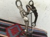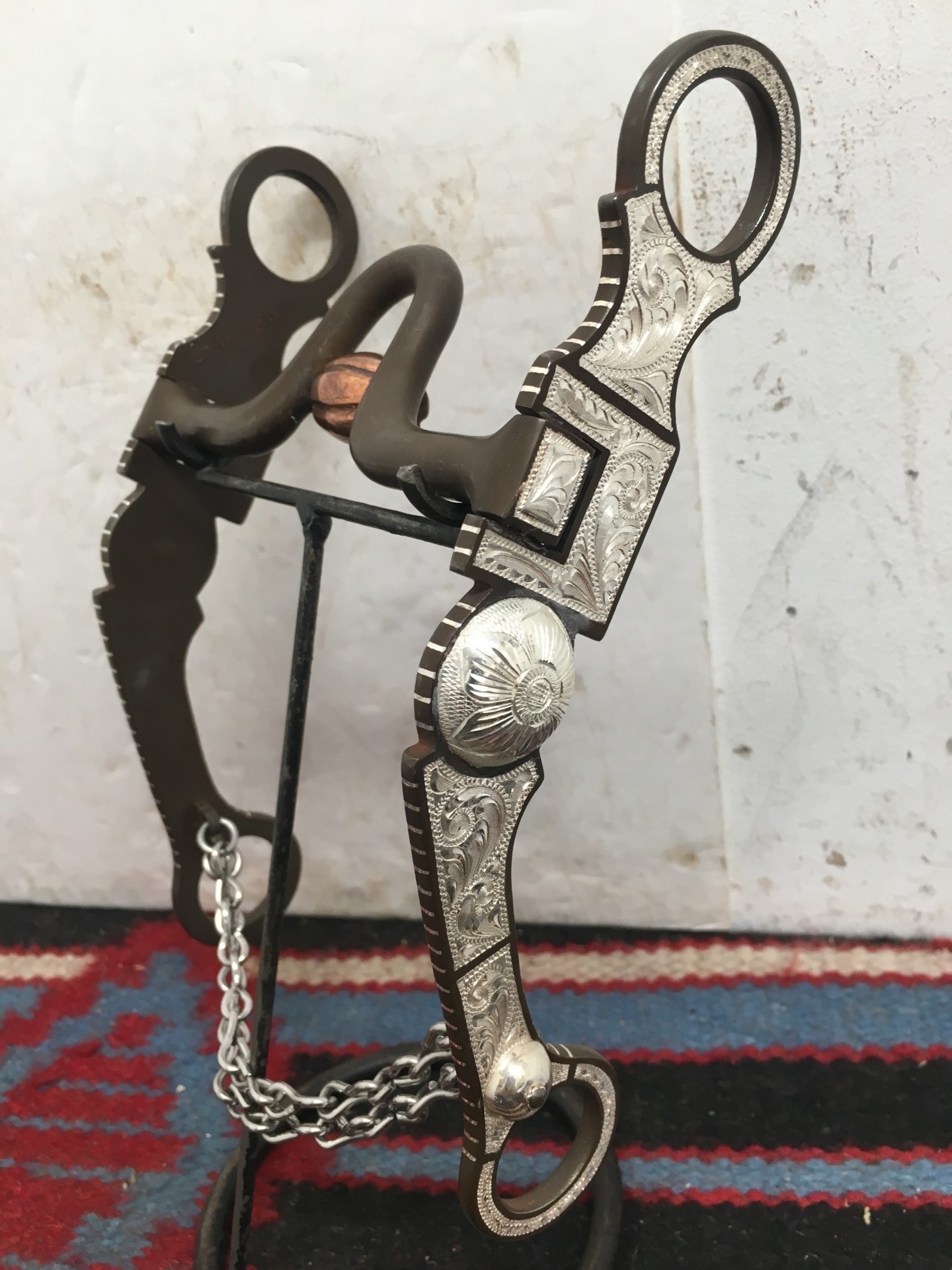 Quality CHARLIE’S marked bit with 7 5/8" cheeks and 5 1/8" mouth, in unused condition. Well balanced bit with copper inlays in the back of the mouth, inlaid pure silver, well finished steel, good eye appeal. We pay shipping within the 48 states. We accept most forms of credit cards , Pay Pal, money order, or check.