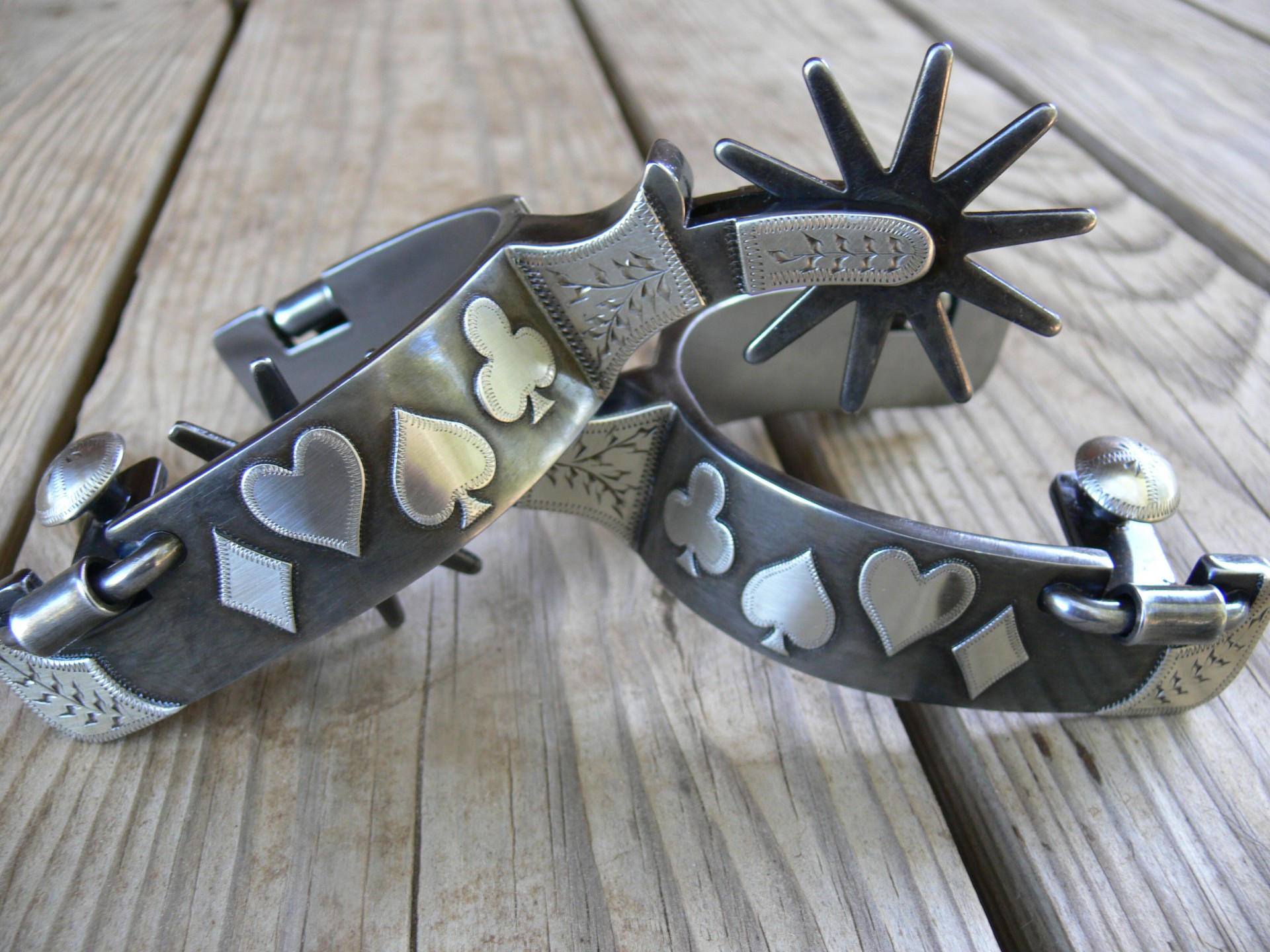 Handmade Bits & Spurs for Sale: RAY CASTLEBERRY DBL MTD CARD SUIT SPURS SOLD #111798