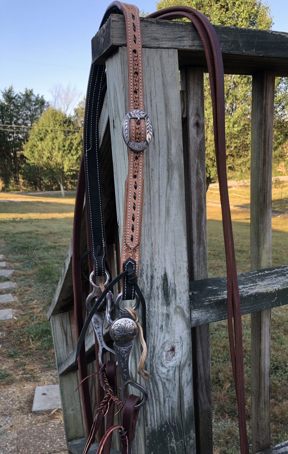 Very lightly used Tom Palmer mounted port bit on a new Rafter 2H leather roughout, lined, stamped, stitched with buckstitch split ear made by Brandon House with a 3/4” Mike Anders mounted cart buckle. Pretty nice combination here. Has good curb chain and bit hobble and new set of heavy 5/8” weighted end reins 8’ long. Will sell any and all. PLEASE TEXT OR CALL ONLY. Thank you.