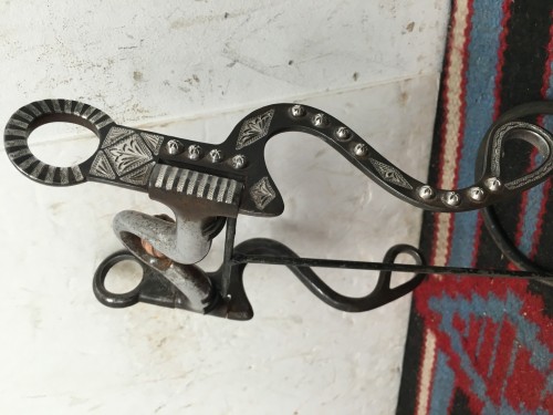 VAQUERO T&T marked bit in really good condition with 7 7/8" cheeks and 5" mouth. The mouth has many inlaid copper strips in the mouth that is of a larger diameter than most. The bit has some weight to it, the inside shank edges have been rounded and is of really nice quality. We pay shipping within the 48 states. We accept most credit cards, Pay Pal, money order, or check.