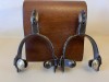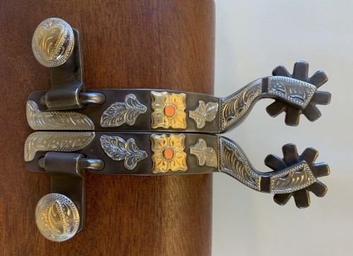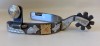 Measurements: Heel Band Width ¾”, Shanks 1 ¾”, Rowel Diameter 1 ¼”, Rowel Points 8, Heel Opening a little less than 3”, Weight of Both Spurs 15.9 ounces