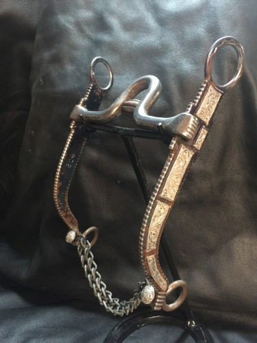 Great bit wearing one of the best known marks out there! Loose cheeked “Hashknife” measures out to 8-1/4” long. Mouthpiece stands at 2” with copper roller and inlaid copper bars on a 5-1/4” wide mouth.