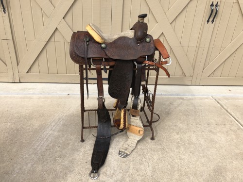 This is an old Tripping saddle that was Custom Made by Cajun of Ft Worth Texas This was built on an Severe Bros. tree of Pendleton Oregon It has Andrew Hardware This saddle has been taken care off will hold up to anything you want to rope and it has many years left. If you have any Questions Call or Text me Lanny Tate at 817-810-5775