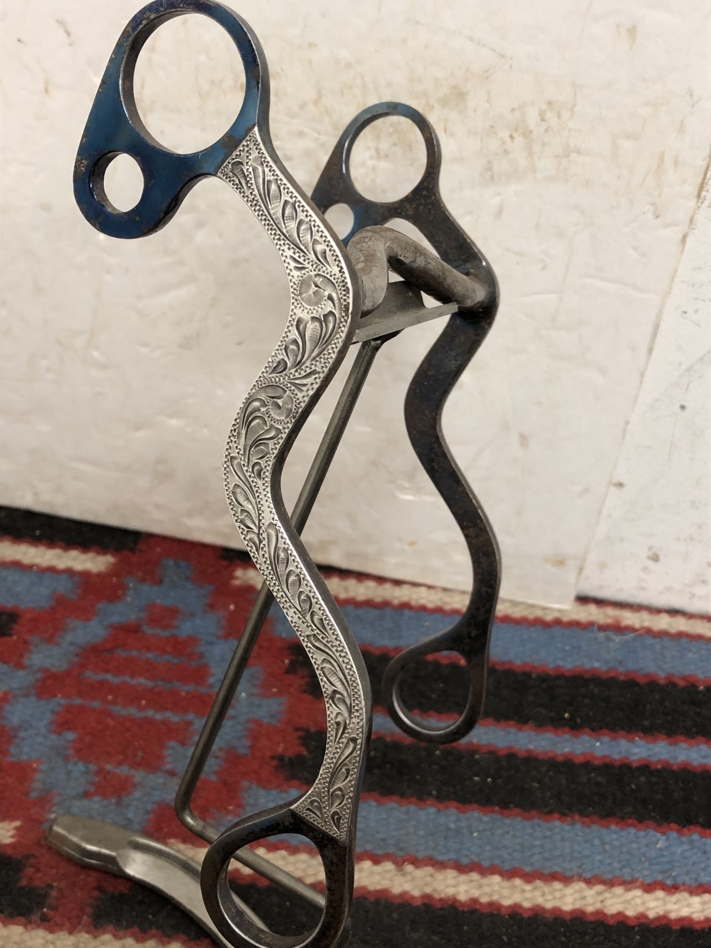 Quality bit that appears to be sterling overlaid. The engraving is top notch. Bit does not show much use, is marked JANICE, 5 1/16" mouth, 8 1/8" cheeks, copper inlays in the mouth. Do not know the history of this bit, but it is quality. We pay shipping within the 48 states. We accept most credit cards, Pay Pal, money order, or check.