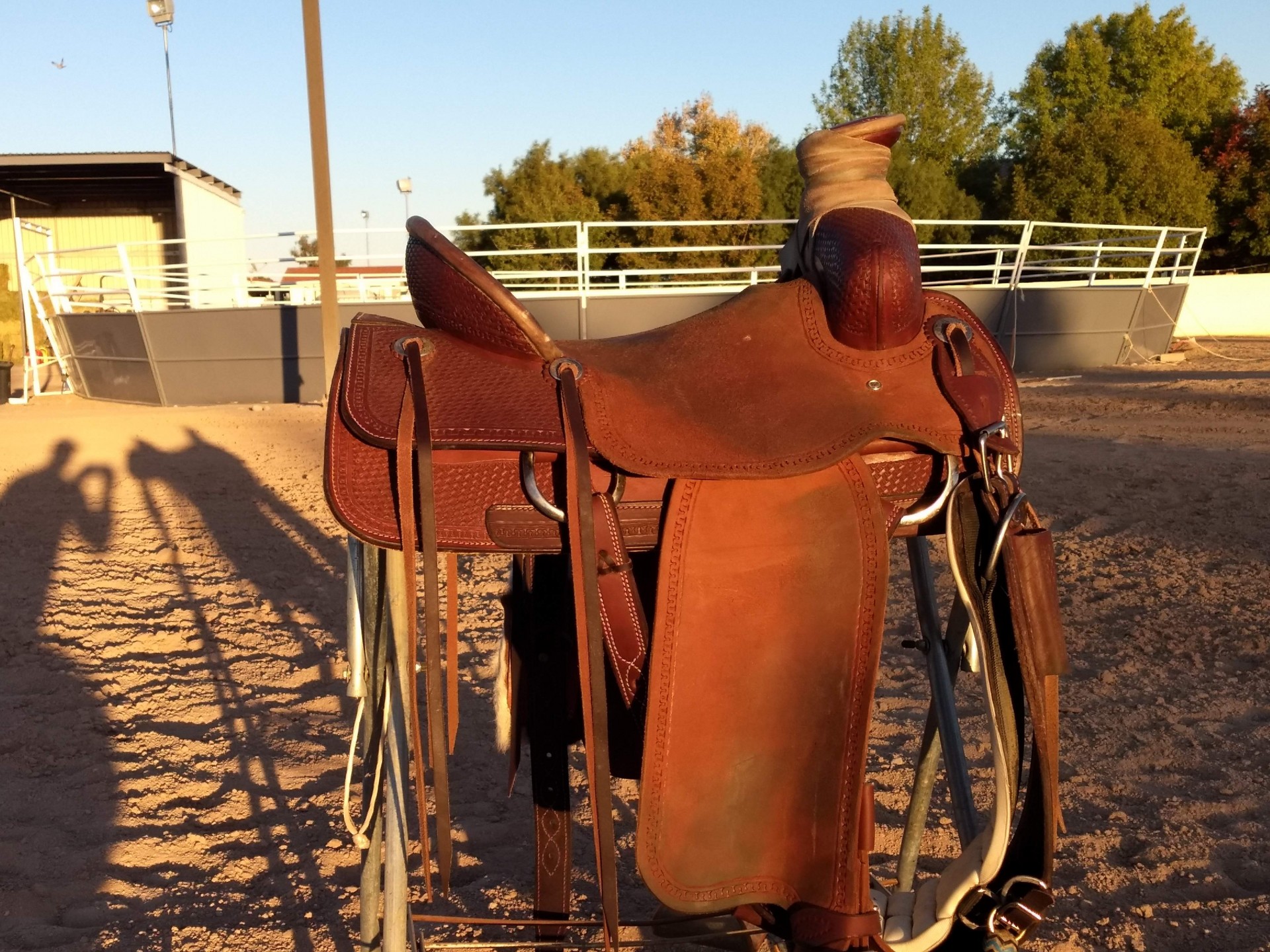 16" Corriente Saddle Co. Ranch/Association with Guadalajara Horn measures 4.75" across by 3.5" tall, Running W stamping all around the saddle, Rough-Out seat & fenders, Basket Stamp tooling, 6 latigo strings, longer stirrup leathers for taller individuals, Conchos throughout, Mule Hide wrapped horn, Rawhide trim on Horn & Cantle, hoof pick keeper is riveted to left billet. Saddle is in excellent condition, almost new still. Does not come with front cinch or cowhide cell phone case in the photo. Back cinch has minor spur indentations. Shipping costs paid by the buyer. Call with any questions you have 702-277-8592
