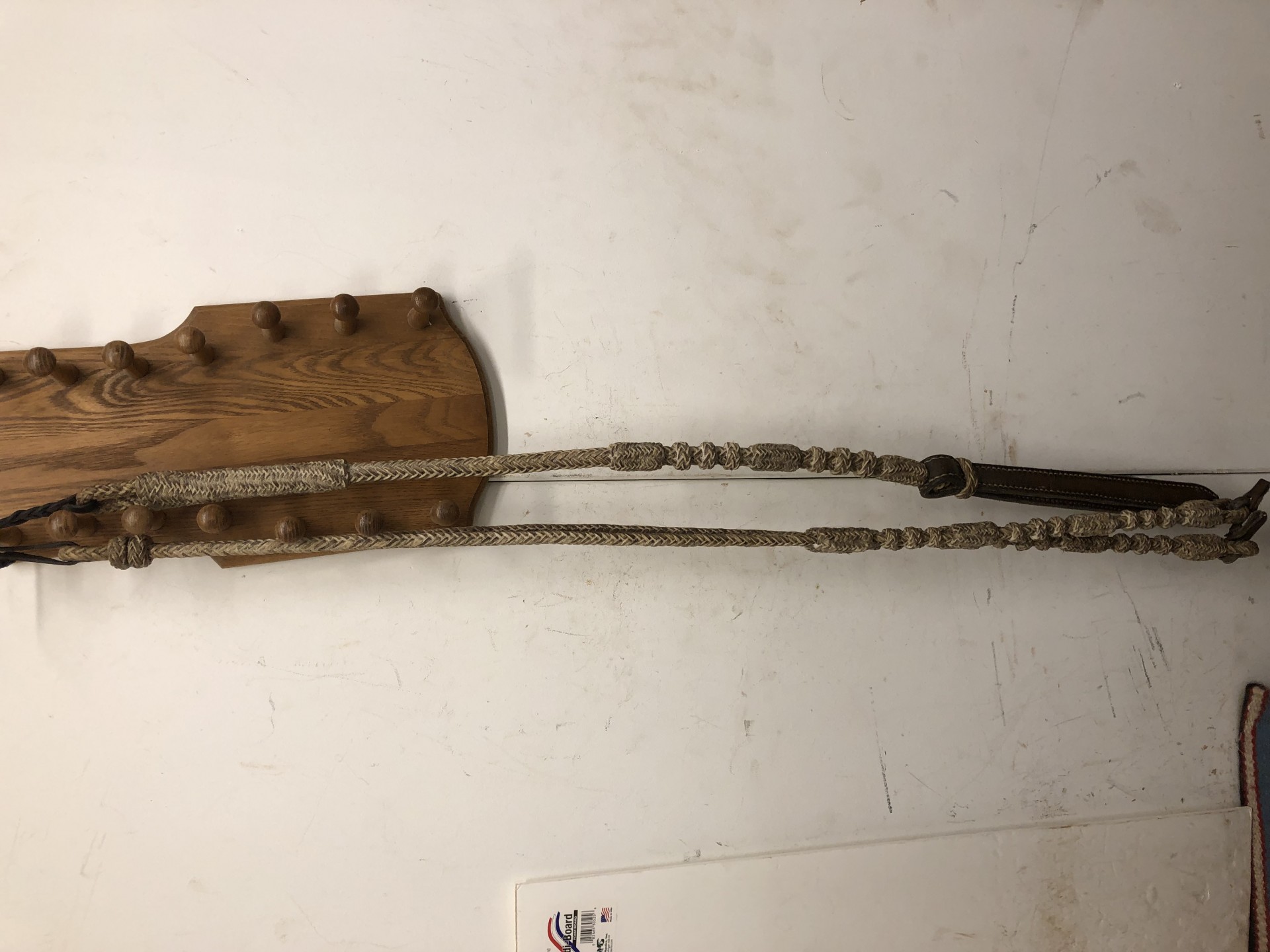 Very, very lightly used romal reins marked LBS, made by noted braider Larry Schied of Yelm, Washington. The body of the reins and romals are square braid. Reins are 3/8" by 42" and the romal including the popper is 41" by just under 5/8". Seldom do I get to own such quality romals. We pay shipping within the 48. We accept most forms of credit cards, Pay Pal, money order, or check